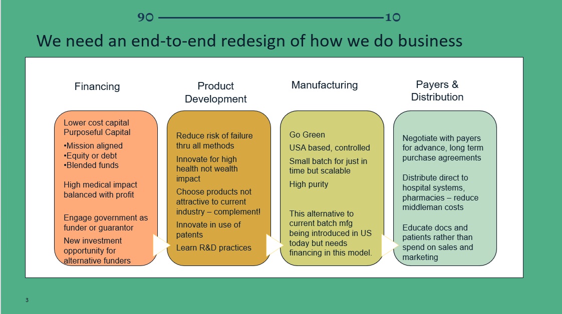 Our Theory of Change is that a new biomedical industry (comprised of emerging companies seeking to operate leanly, focused first and foremost on health, thinking outside patent protections, competing on quality and price, and letting profits flow in measure) will produce affordable medicines for the 90%. We believe the entire process can be optimized for maximum productivity and efficiency, producing sustainable profits in a competitive marketplace.1